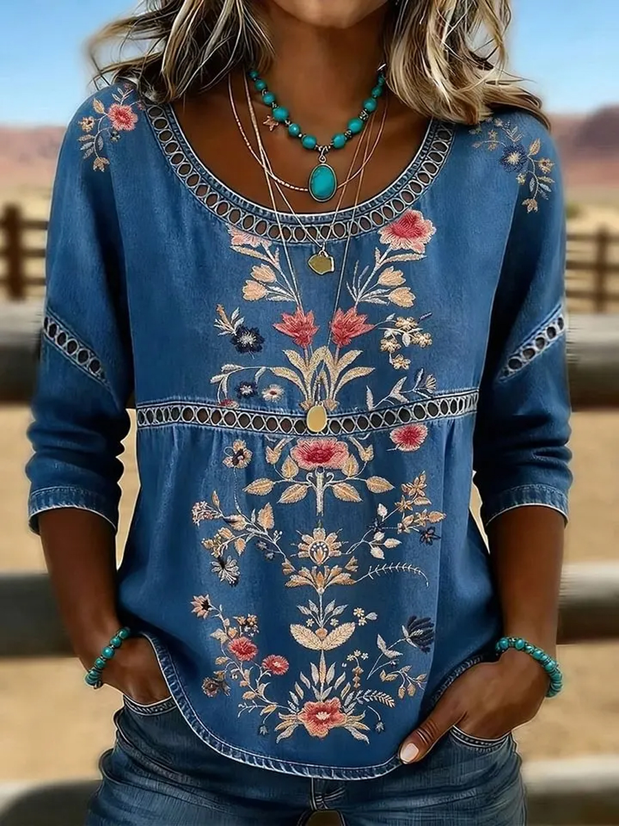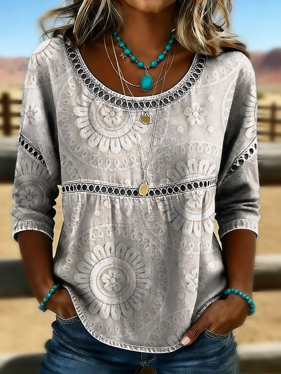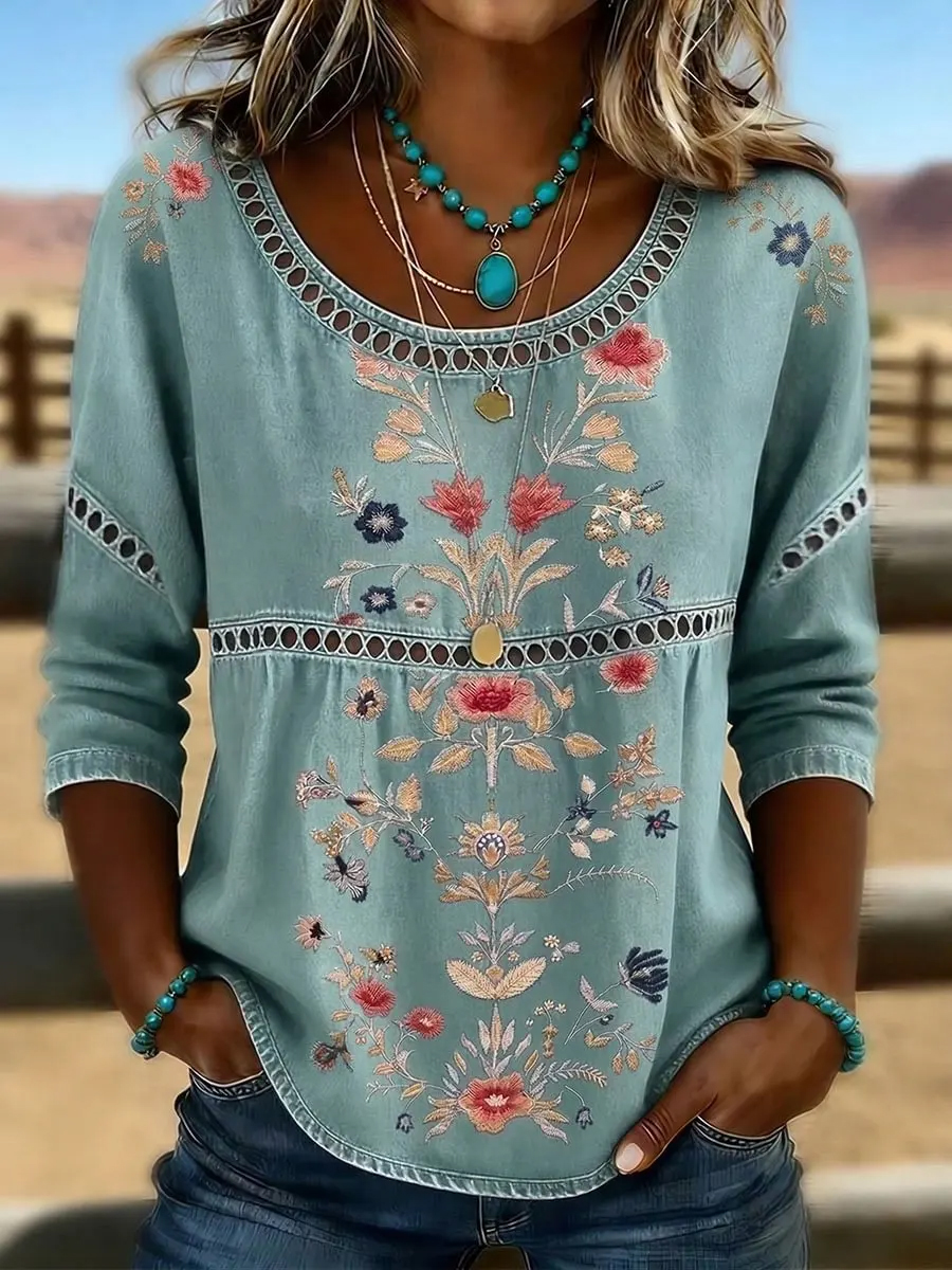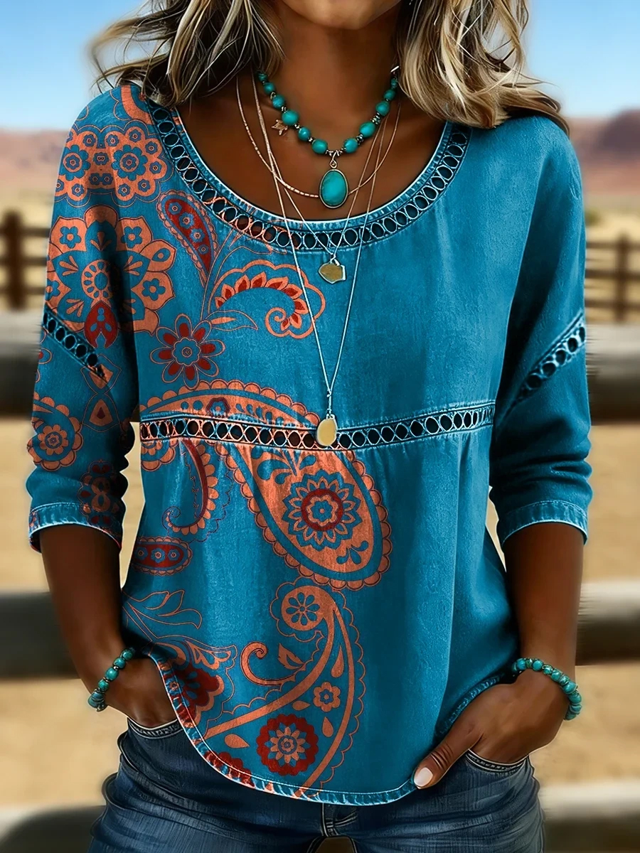 Women's Western Vintage Floral Print Casual O-Neck Top