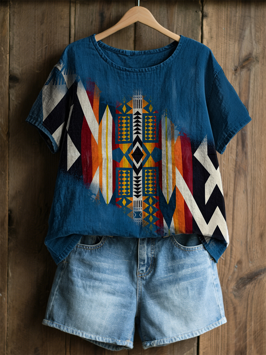 Women's Retro Western Aztec Print Linen Short Sleeves T-shirt