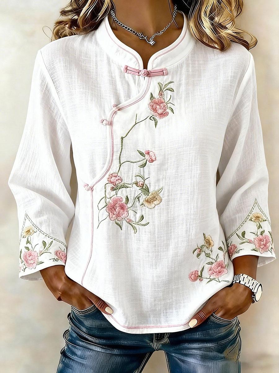 Women's Floral Cotton-Linen Casual Shirt