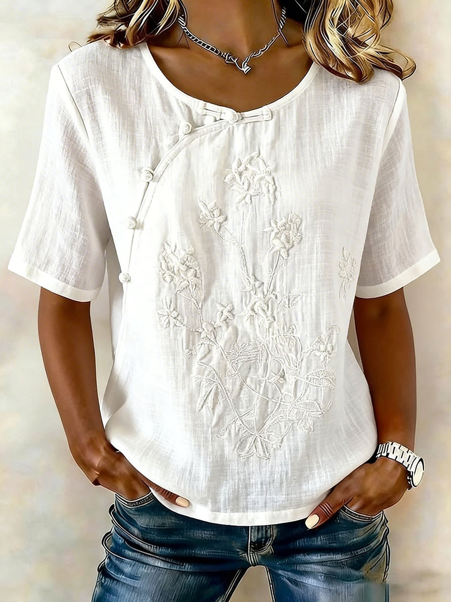Women's Floral Cotton-Linen Casual T-Shirt