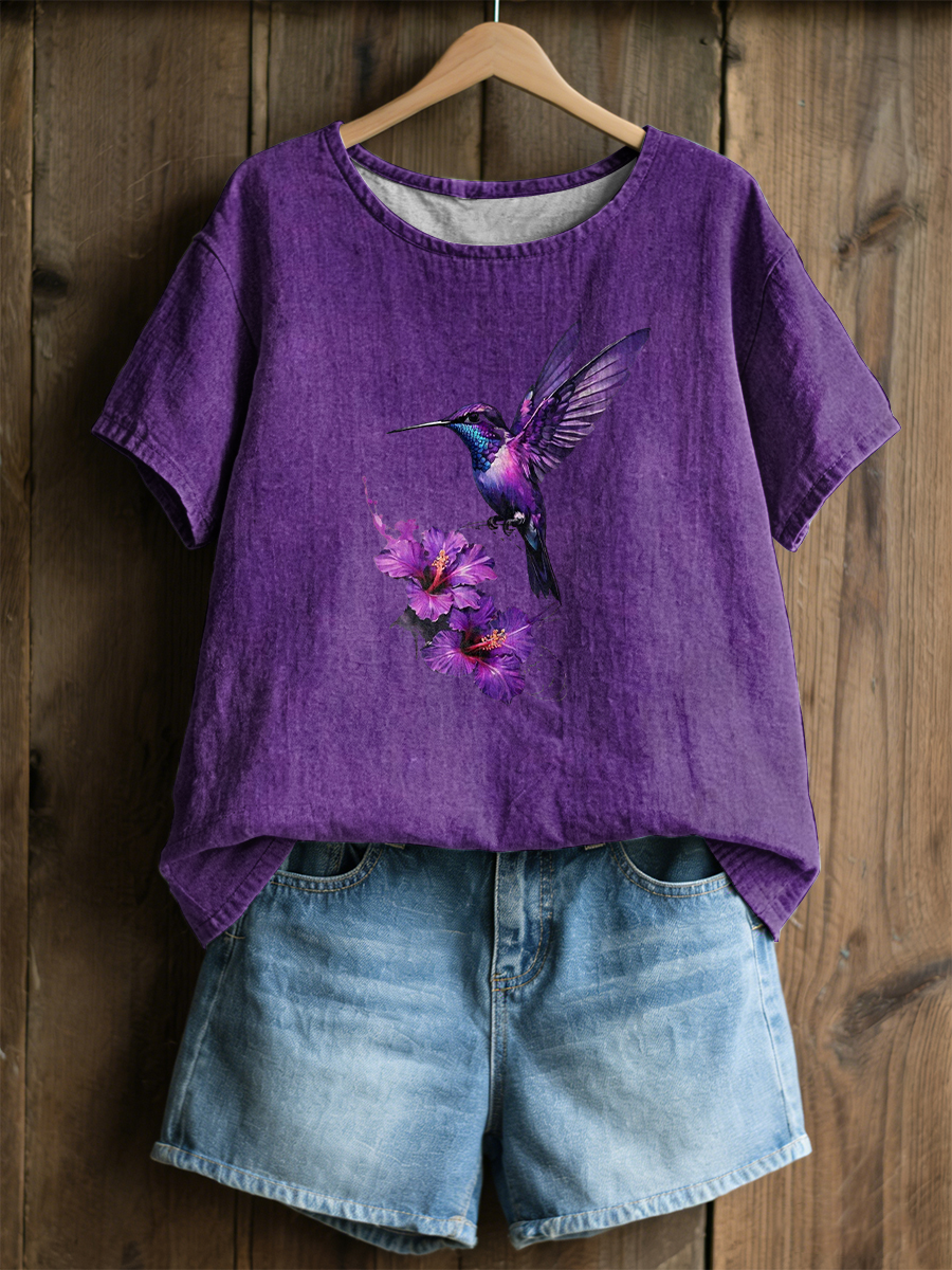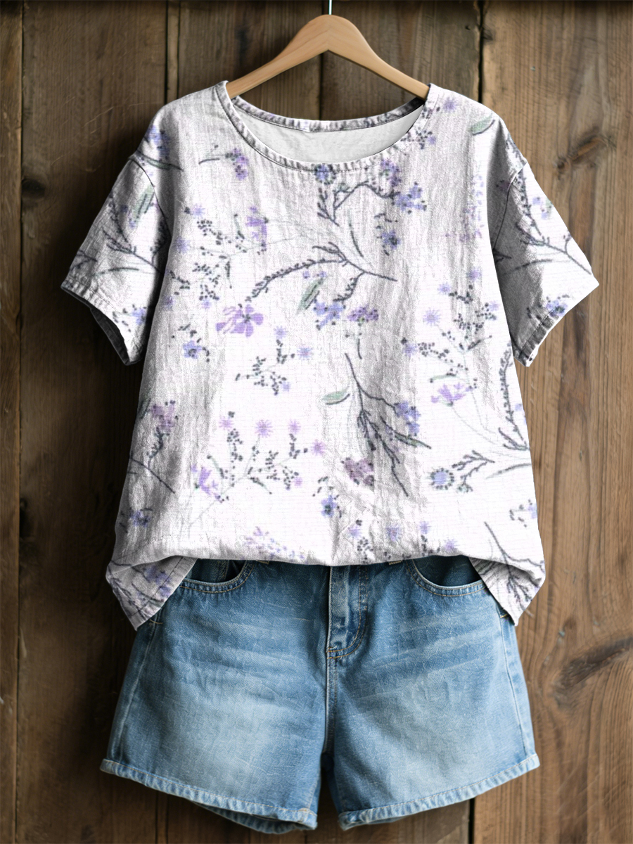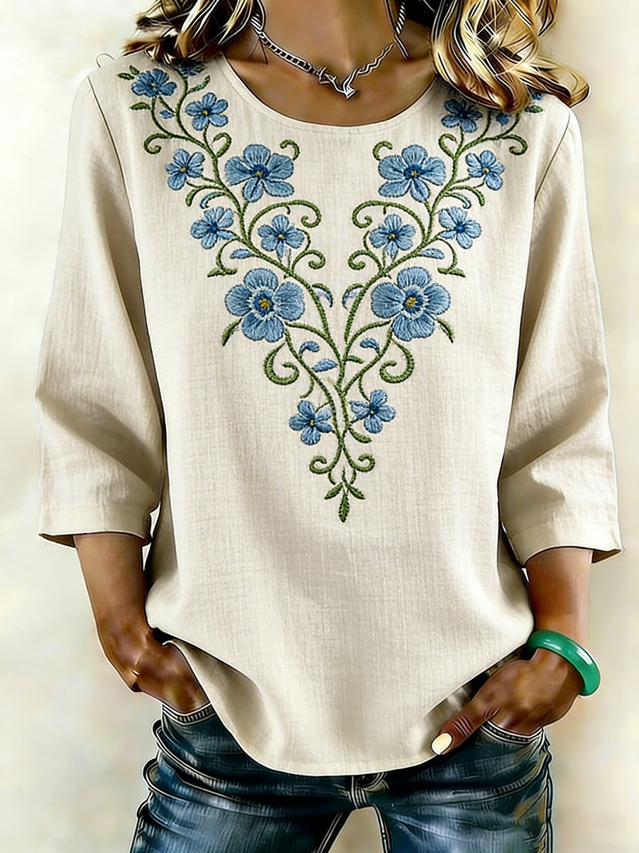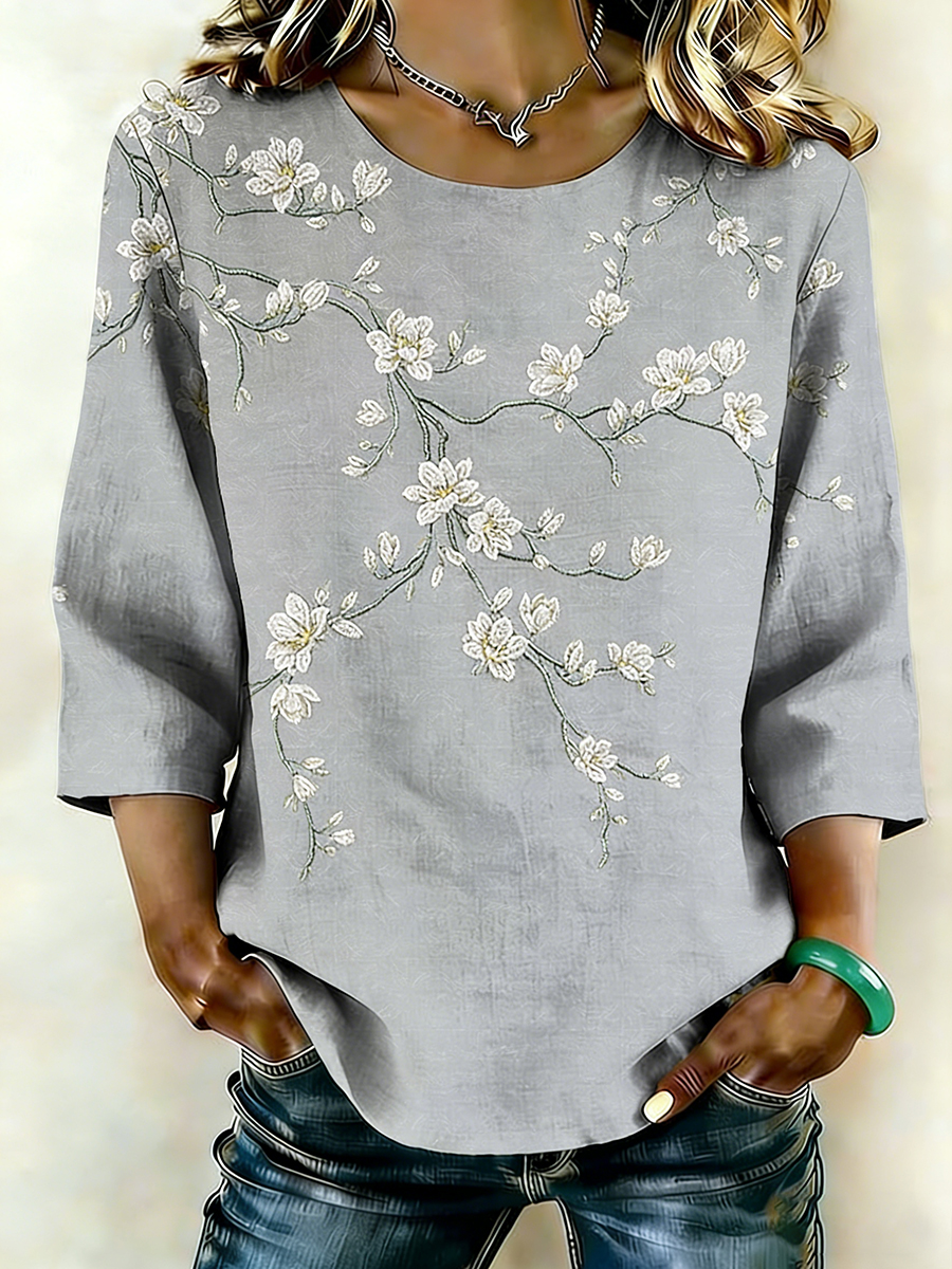Women's Plant And Flower Buttoned And Laced Cotton And Linen Shirt